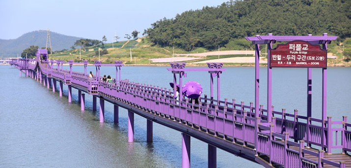 신안 퍼플섬 퍼플교는 안좌도, 반월도, 박지도를 연결하는 보라색 해상 보행교입니다. 각각의 다리 길이는 문브릿지 380m, 반월-박지 간 퍼플교 915m, 박지-안좌 간 퍼플교 547m입니다. 걷기만 해도 약 30분 정도 소요되며, 전천후 교량인 부잔교가 열릴 때 배들이 지나가는 모습을 감상할 수 있습니다.