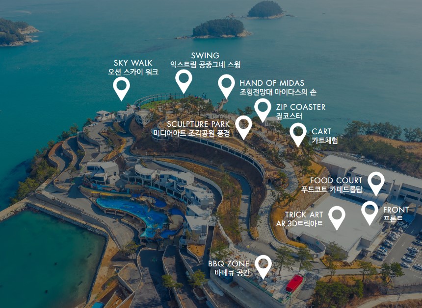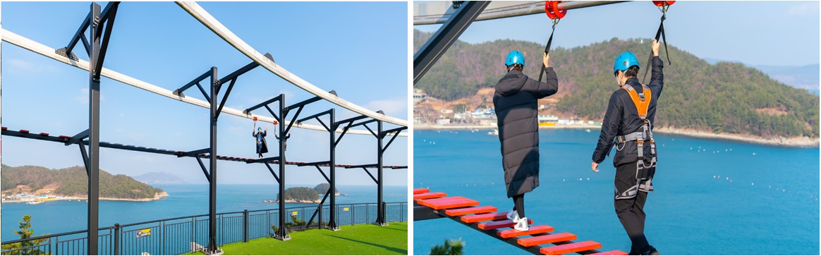 상공 100m에 목재 계단식과 투명 강화유리를 바닥에 설치하여 안전장치를 착용한 후 아찔한 구름다리를 지나 집라인도 탈 수 있는 스릴 넘치는 오션스카이워크입니다.